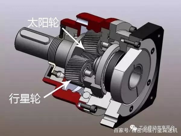 驅(qū)動源采用直結(jié)或連接方式啟動太陽齒輪,太陽齒輪將組合于行星架上的行星齒輪帶動運(yùn)轉(zhuǎn)。整組行星齒輪系統(tǒng)沿著外齒輪環(huán)自動繞行轉(zhuǎn)動,行星架連結(jié)出力軸輸出達(dá)到減速目的。更高減速比則借由多組階段齒輪與行星齒輪倍增累積而成。