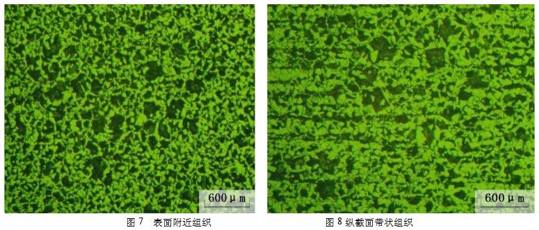 輸出軸縱截面上組織呈帶狀組織、局部(即近表面)組織中的鐵素體呈網(wǎng)狀、針狀分布,仍與鍛后的熱處理工藝相關(guān)。帶狀組織的存在使輸出軸的力學(xué)性能形成各向異性,降低了輸出軸的塑性、沖擊韌性和斷面收縮率等。