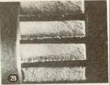 圖28:圖示滲碳齒輪角部已被敲掉,表明齒角在破裂之前受到多次重復(fù)的沖擊(撞擊),此時(shí)不適當(dāng)?shù)淖矒羰窃斐善茐牡脑?/span>