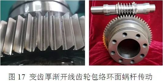 為了克服變齒厚平面蝸輪包絡(luò)環(huán)面蝸桿傳動無法進(jìn)行精確調(diào)整側(cè)隙和精確補(bǔ)償磨損量的缺點(diǎn),陳永洪[70-71]提出變齒厚漸開線齒輪包絡(luò)環(huán)面蝸桿傳動,如圖17所示。樣機(jī)傳動精度累計誤差為54.95〞及短周期誤差為23.32〞;傳動副側(cè)隙調(diào)整至最小28.88〞;磨損量可有效補(bǔ)償,補(bǔ)償后傳動精度不變。